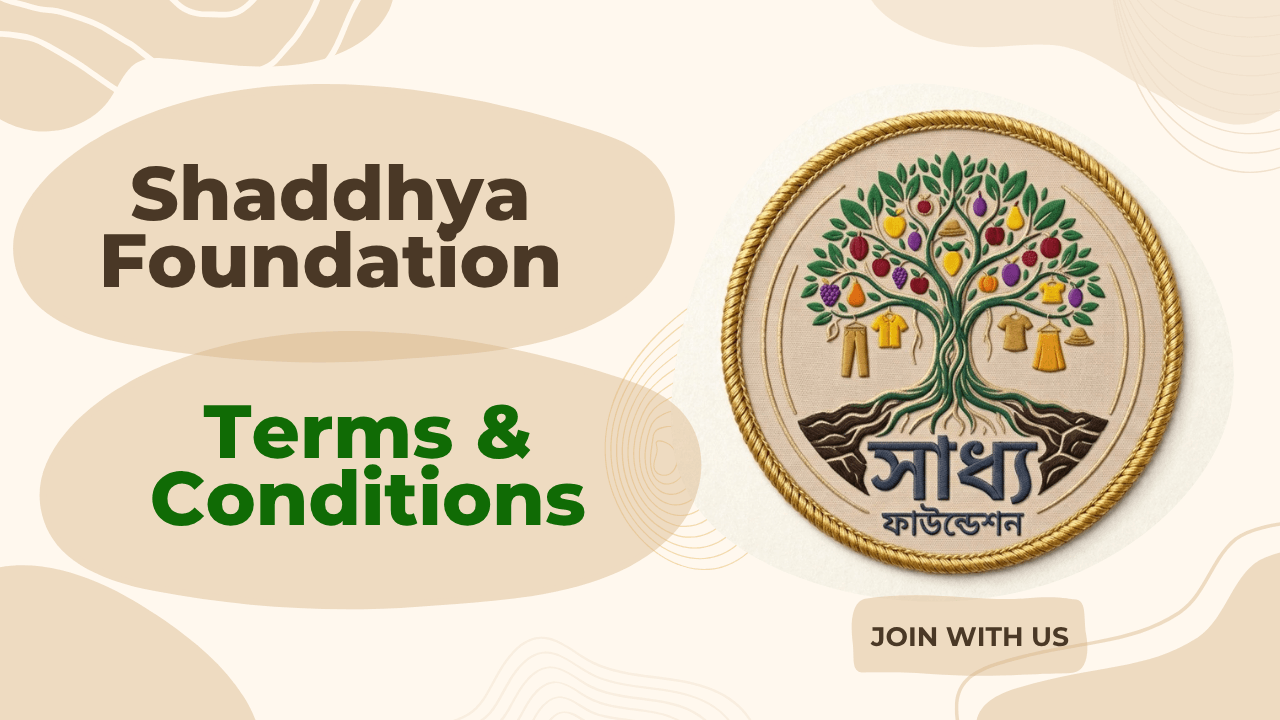 শদ্ধ্যা ফাউন্ডেশনে আপনাকে স্বাগতম। আমাদের ওয়েবসাইট এবং ডোনেশন সার্ভিস ব্যবহার করার মাধ্যমে আপনি এই শর্তাবলী মেনে চলতে সম্মত হন। এই শর্তাবলী আমাদের প্ল্যাটফর্মের নিরাপদ, স্বচ্ছ এবং দায়িত্বশীল ব্যবহারের নিশ্চয়তা দেয় এবং দাতা, সুবিধাভোগী ও সংস্থার সুরক্ষা নিশ্চিত করে।